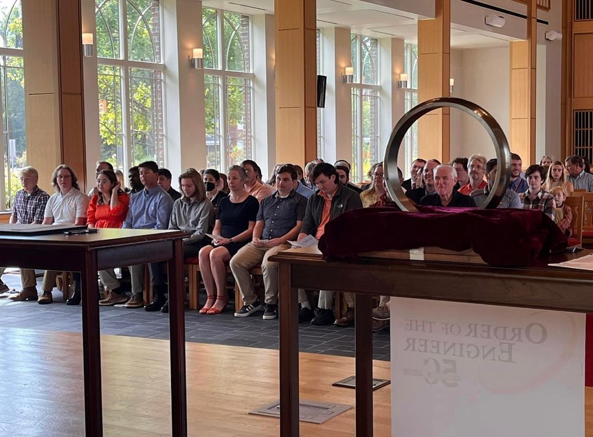 The Order of the Engineer is a commitment to uphold the ethical responsibilities of being an engineer. Our seniors are invited to participate in an initiation ceremony in Butler Chapel, where they make a pledge called the Obligation of the Engineer and receive a stainless steel ring to be worn on the little finger of their writing hand. Seniors who have passed the Fundamentals of Engineering Exam, the first step to professional engineering licensure, also receive their FE cords from a member of the North Carolina Board of Examiners for Engineers and Surveyors (NCBELS).