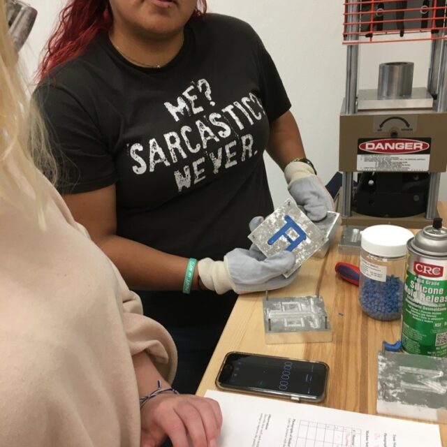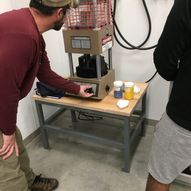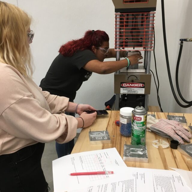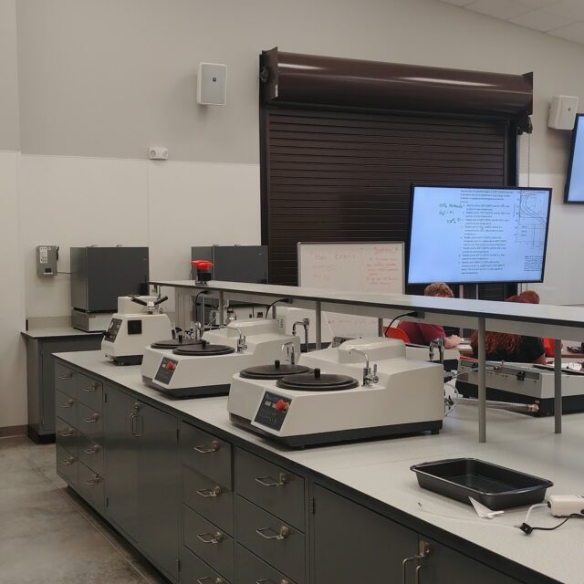 The Materials Classlab houses equipment used in the Materials Science and Processing and Statics and Strength of Materials courses. In this space, students use Tinius Olsen machines to twist, stretch, and bend material samples to their breaking points, furnaces to process metal and glass, and microscopes to understand the microstructure of materials after mounting, sanding, and etching the samples using the available equipment. Students work together to understand how different materials act and react from the micro to the macro scale to learn how to choose materials for engineering applications.